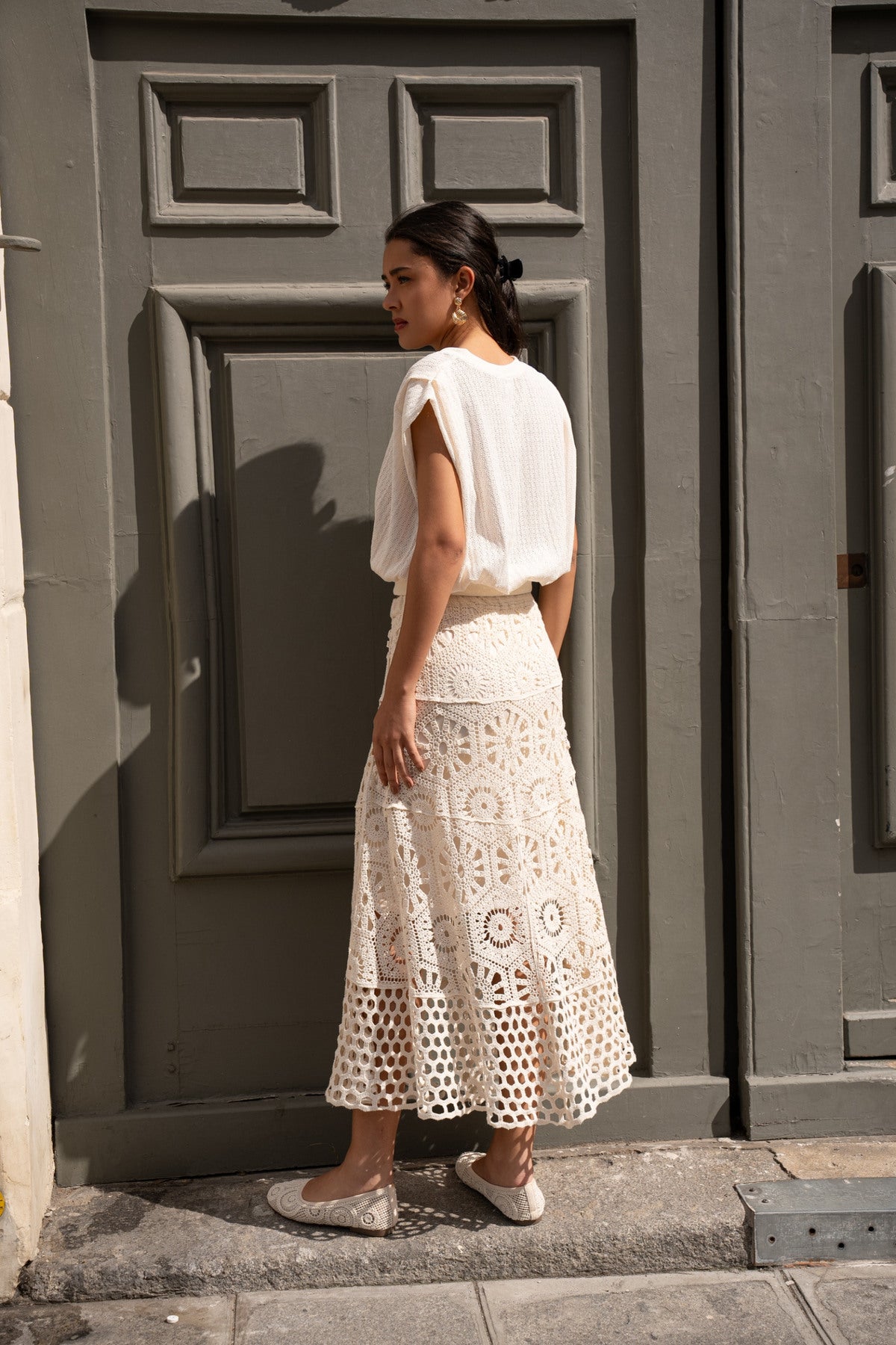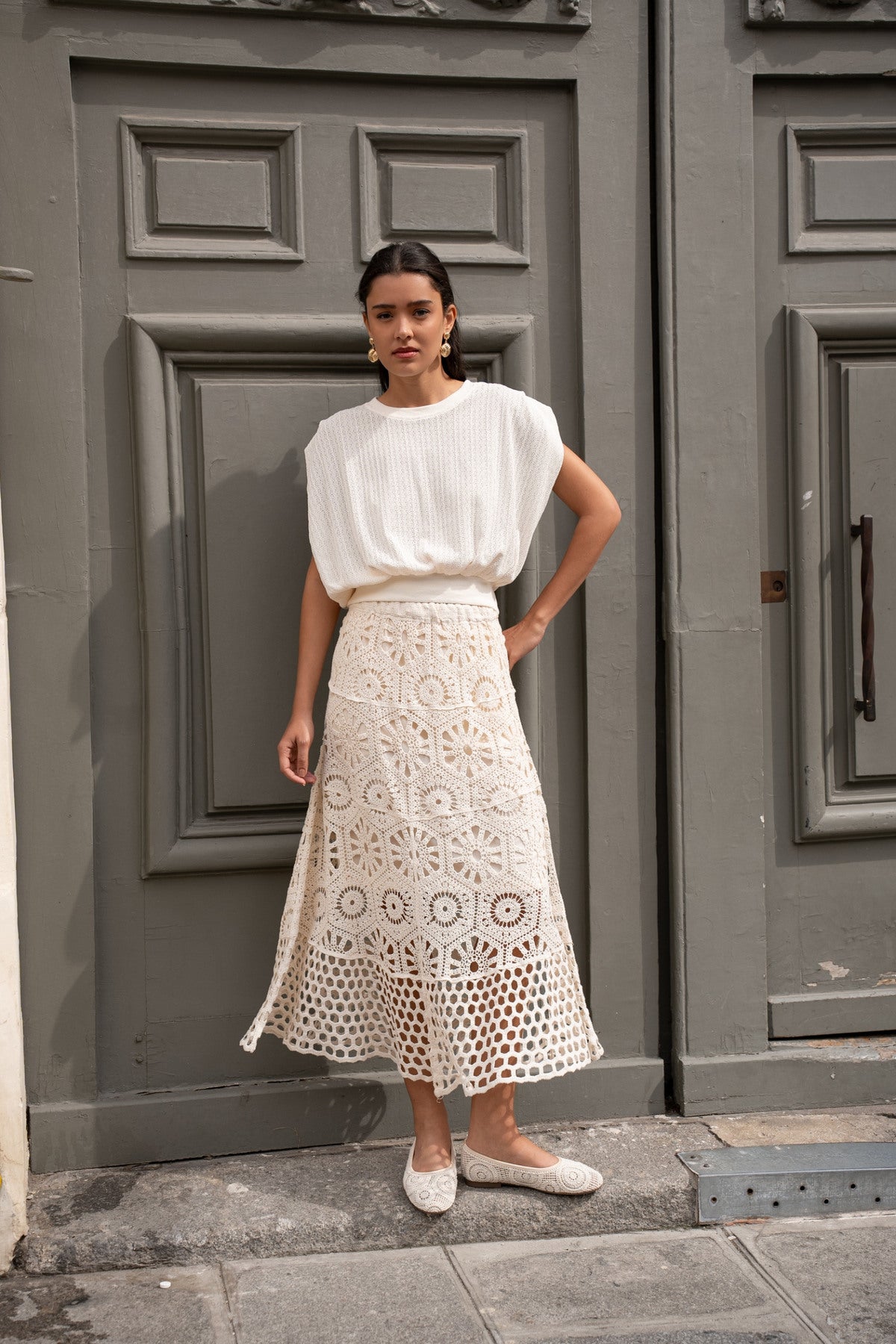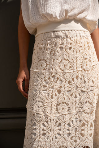Šis šviesios (ivory / smėlinės) spalvos nėriniuotas sijonas – elegantiškas ir itin moteriškas pasirinkimas, puikiai tinkantis tiek kasdieniams deriniams, tiek ypatingoms progoms. Ilgas, tiesus ir šiek tiek platėjantis kirpimas kartu su ažūriniu nėrinių raštu suteikia lengvumo, subtilaus romantikos ir boho stiliaus pojūtį.
