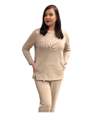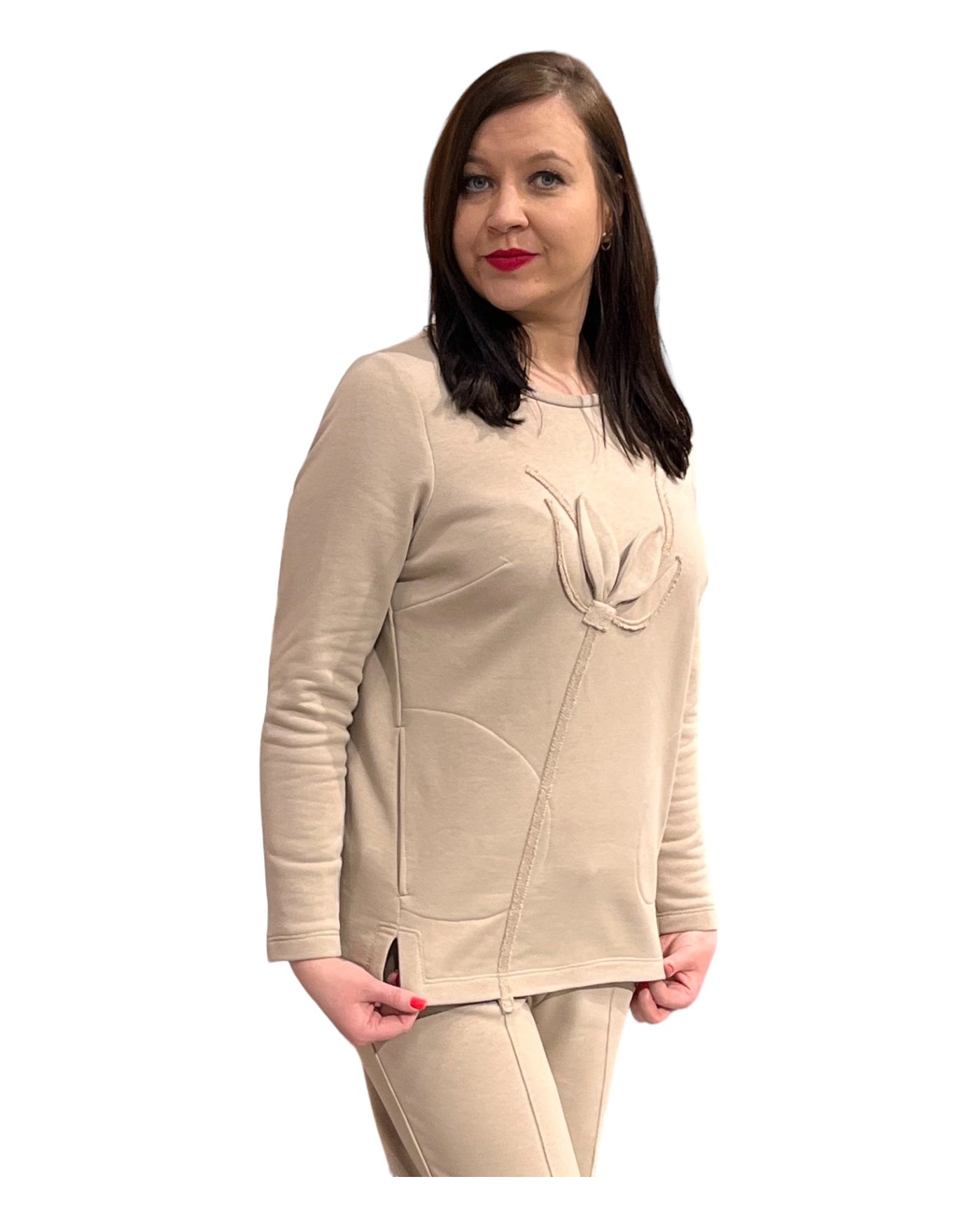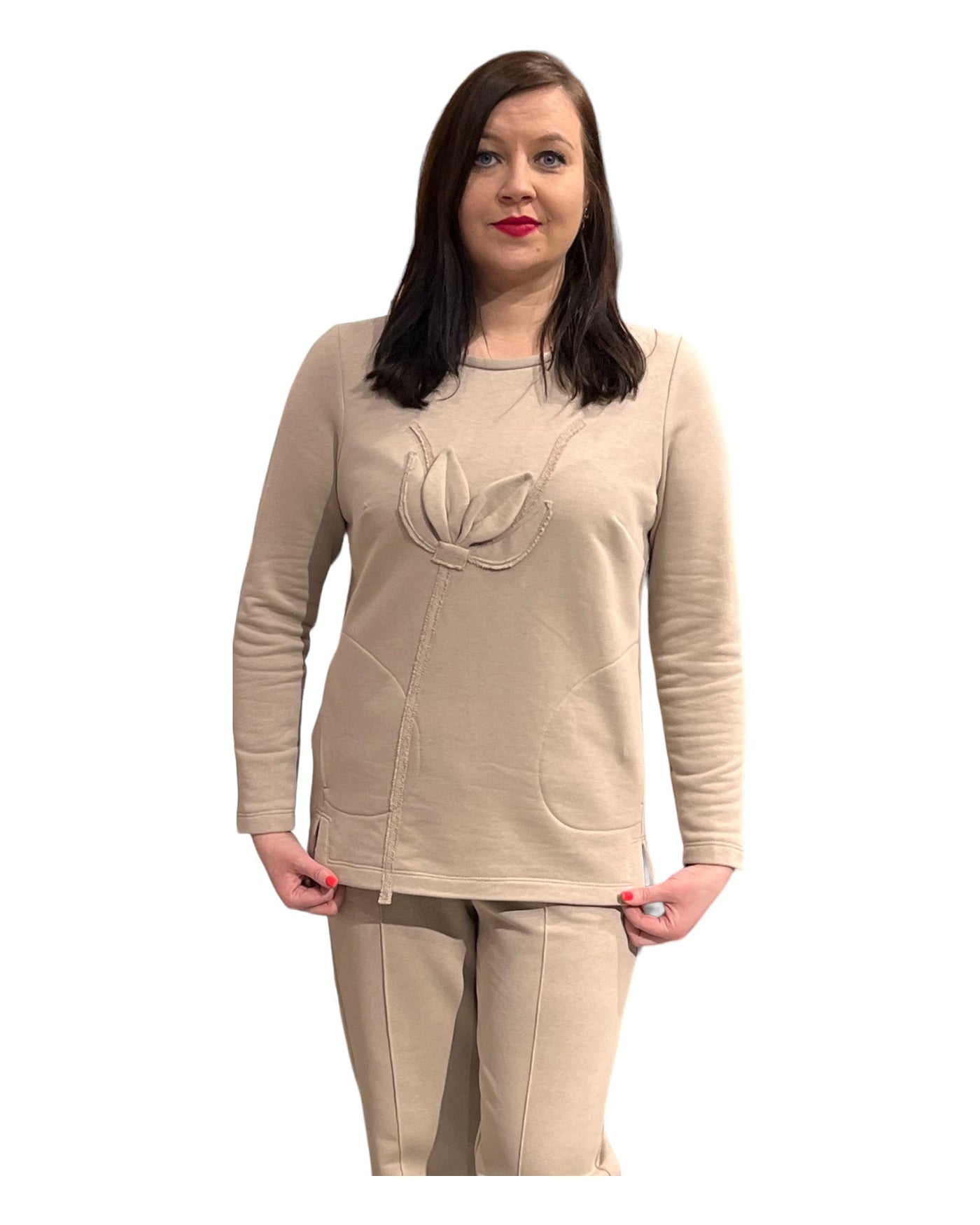 ♦ Pasiūtas iš labai kokybiško, vidutinio storumo, trisiūlio smėlinės spalvos trikotažo . Tai puikios kokybės, modernus bei novatoriškas kilpinis trikotažas, jo sudėtis: 95 % medvilnės, 5 % elastano. Išplovus nesiburbuliuoja.