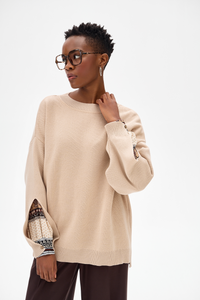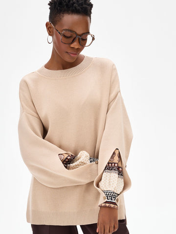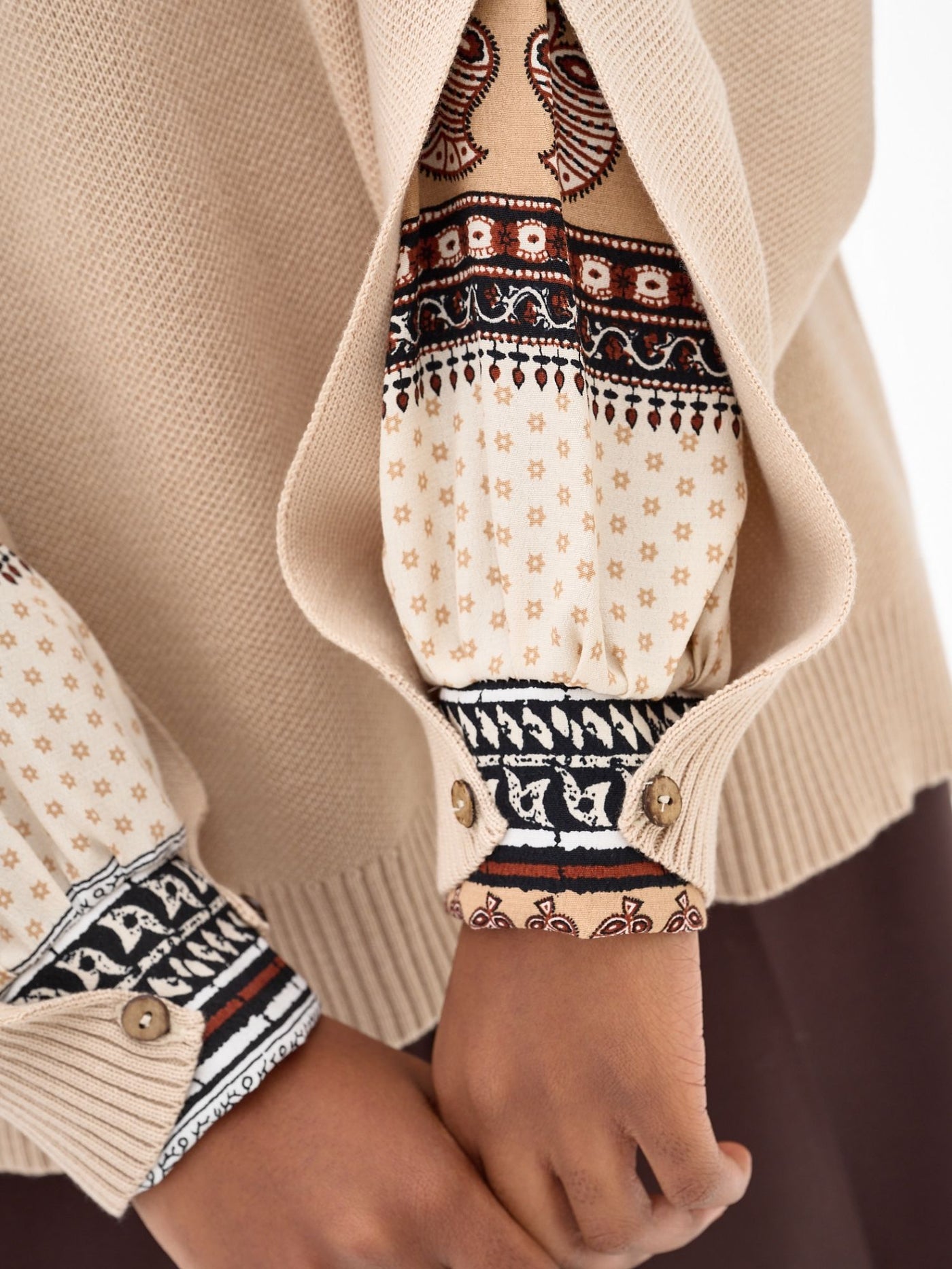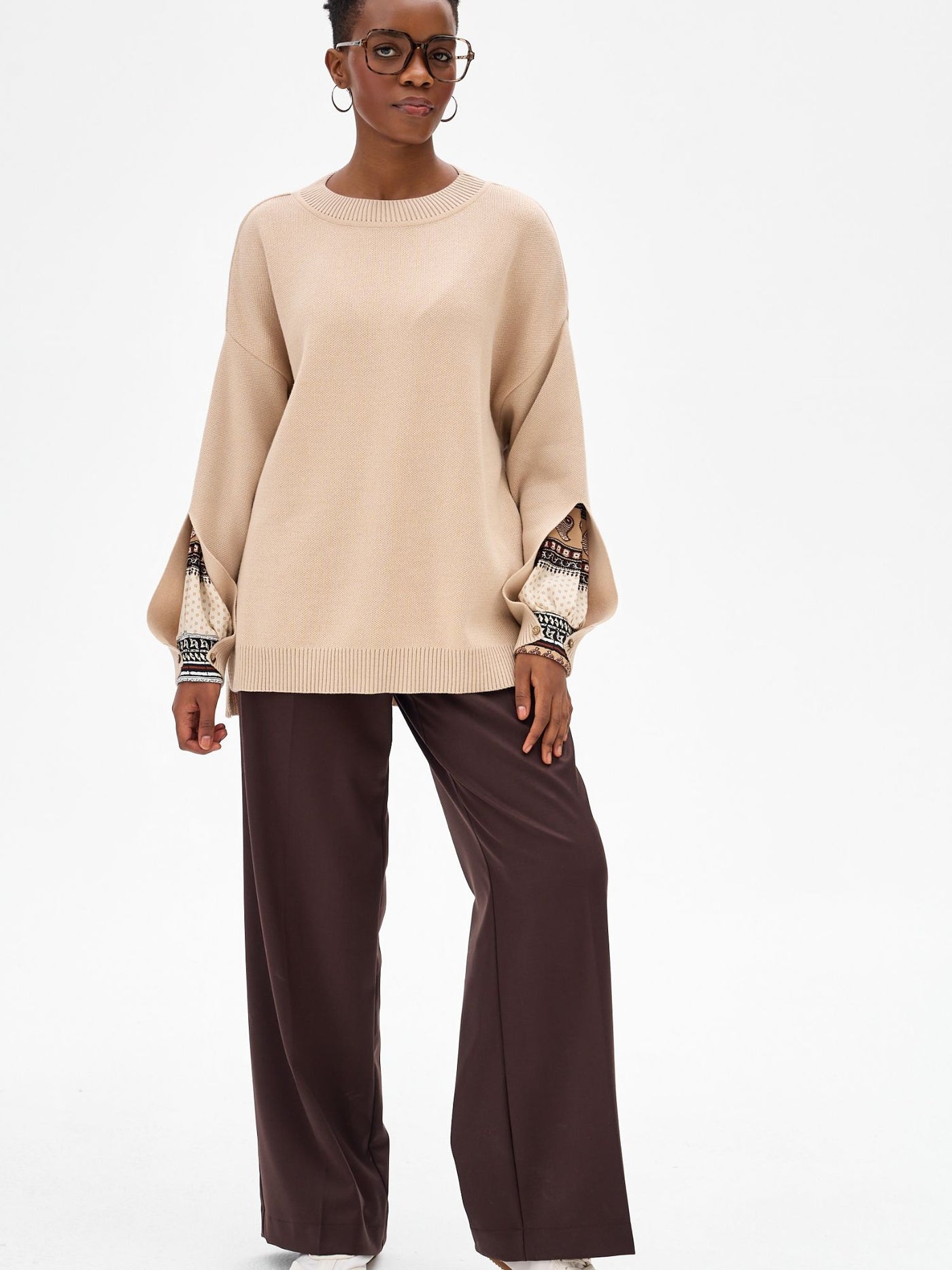 Išskirtinė šio modelio detalė – rankovių viduje esanti viskozės audinio dalis su dekoratyviniu raštu, kuri suteikia megztukui originalumo. Atlenktos rankovės ar judant atsiverianti vidinė audinio dalis sukuria subtilų kontrastą ir stilingą akcentą.