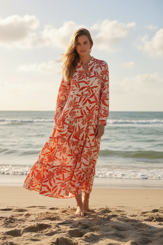 Atraskite neprilygstamą vasaros komfortą – ši plazdanti ilgo silueto suknelė žavi savo pieno spalvos fonu ir ryškiu raudonų gėlių raštu. Sukurta taip, kad derėtų tiek atostogų poilsiui, tiek šventiniam vakarui ar jaukiam pasivaikščiojimui mieste.