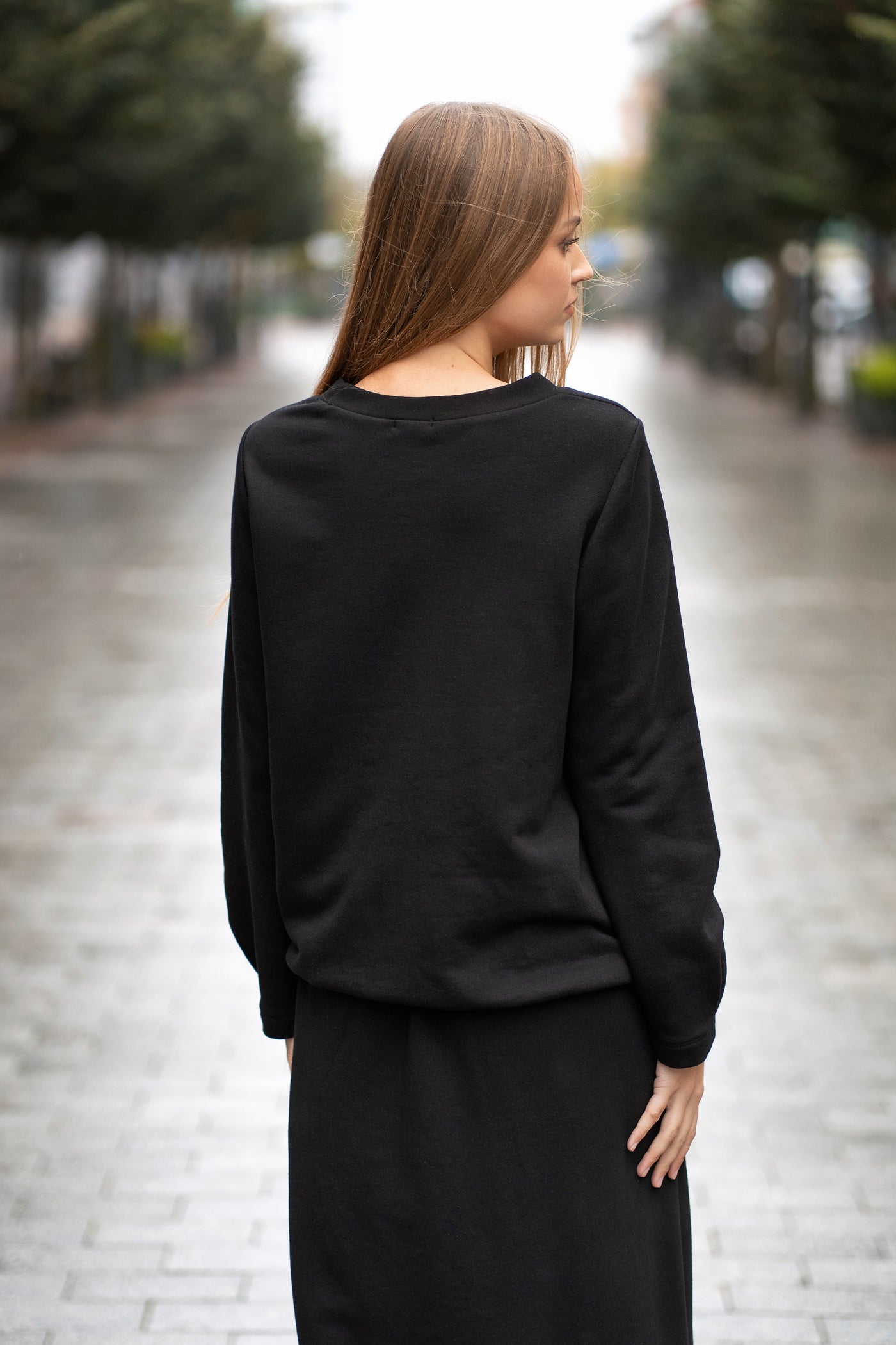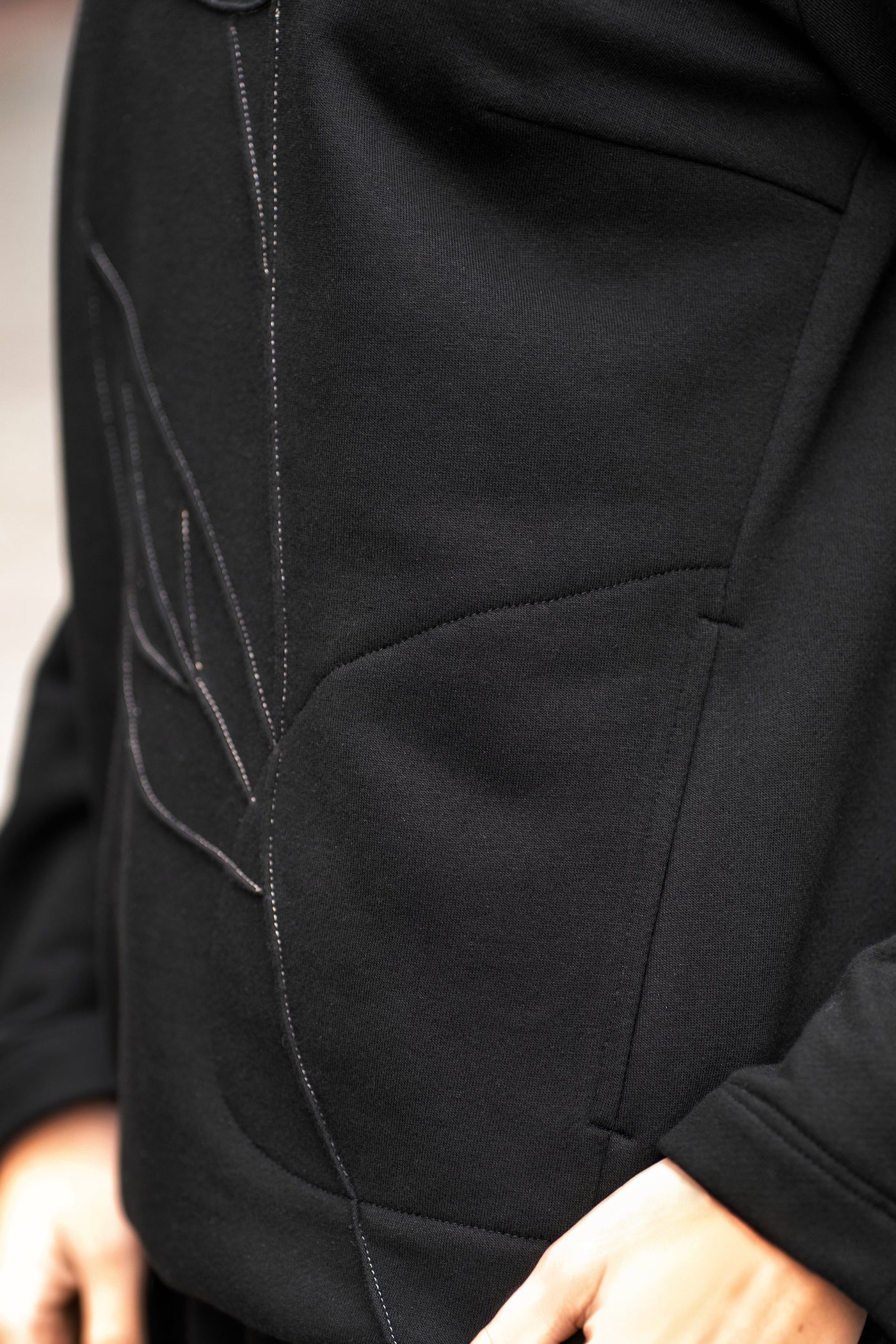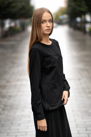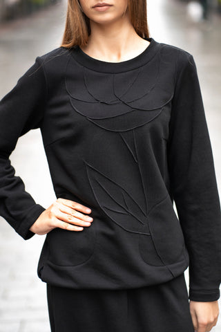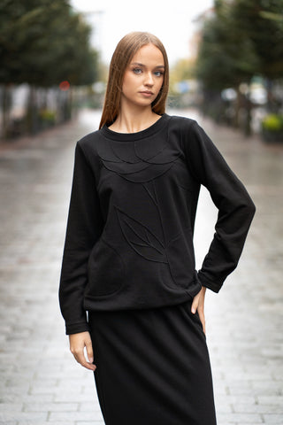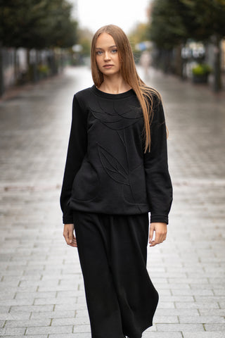 Džemperis (ilgis – 60 cm) puoštas siuvinėta rože priekyje, turi statytas rankoves, patogias kišenes ir reguliuojamą apačią su raišteliu, kad galėtumėte priderinti prie figūros.