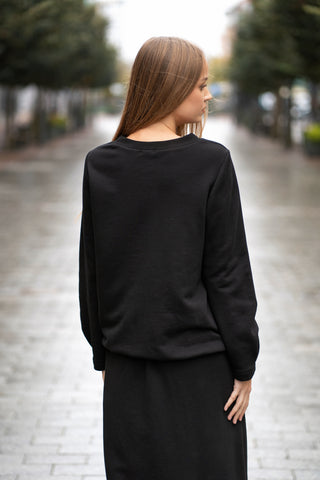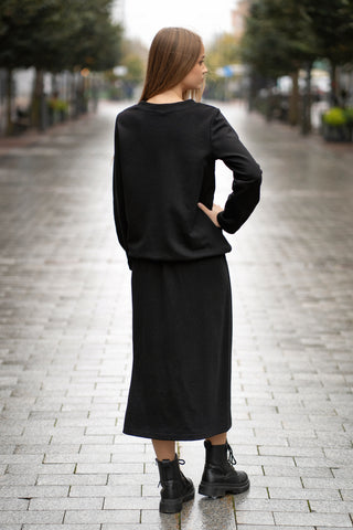 Jį sudaro džemperis ir ilgas sijonas, abu pasiūti iš aukštos kokybės vidutinio storumo trisiūlio trikotažo, kuris nesiburbuliuoja, gerai laiko formą ir yra malonus kūnui. Audinio sudėtis – 95 % medvilnė, 5 % elastanas.