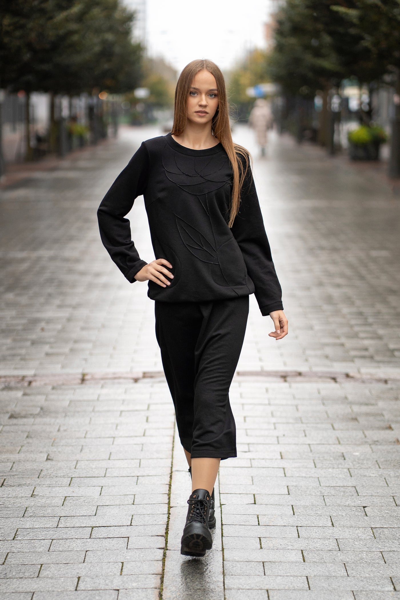 Šis moteriškas trikotažinis kostiumėlis – tai elegancijos ir patogumo derinys, puikiai tinkantis kasdienai, darbui ar pasivaikščiojimams 🍂