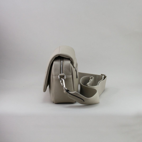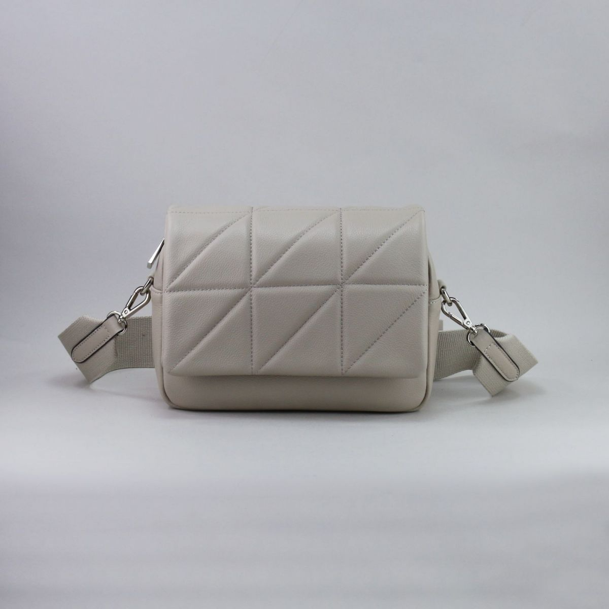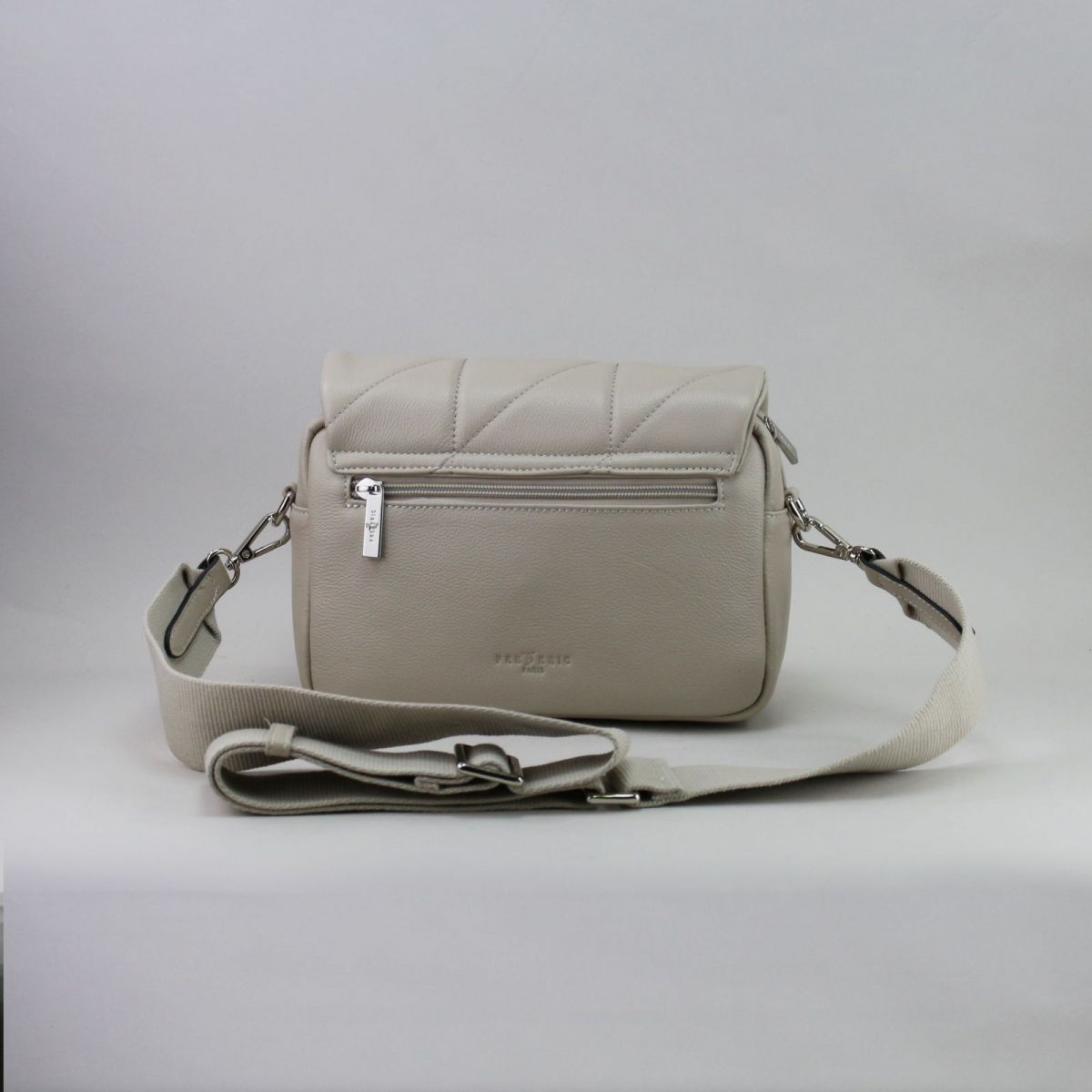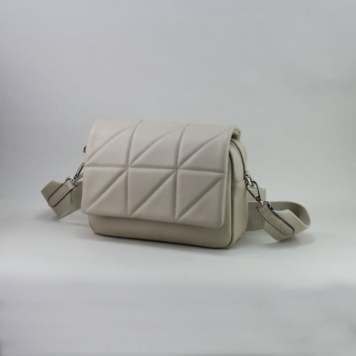 Maža šviesiai pilka natūralios odos rankinė per petį – prancūziškas universalumas