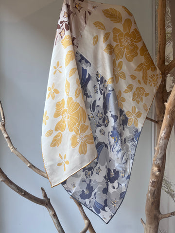 Šilkinė skarelė su geltonais, mėlynais ir rudais gėlių motyvais Išpardavimas