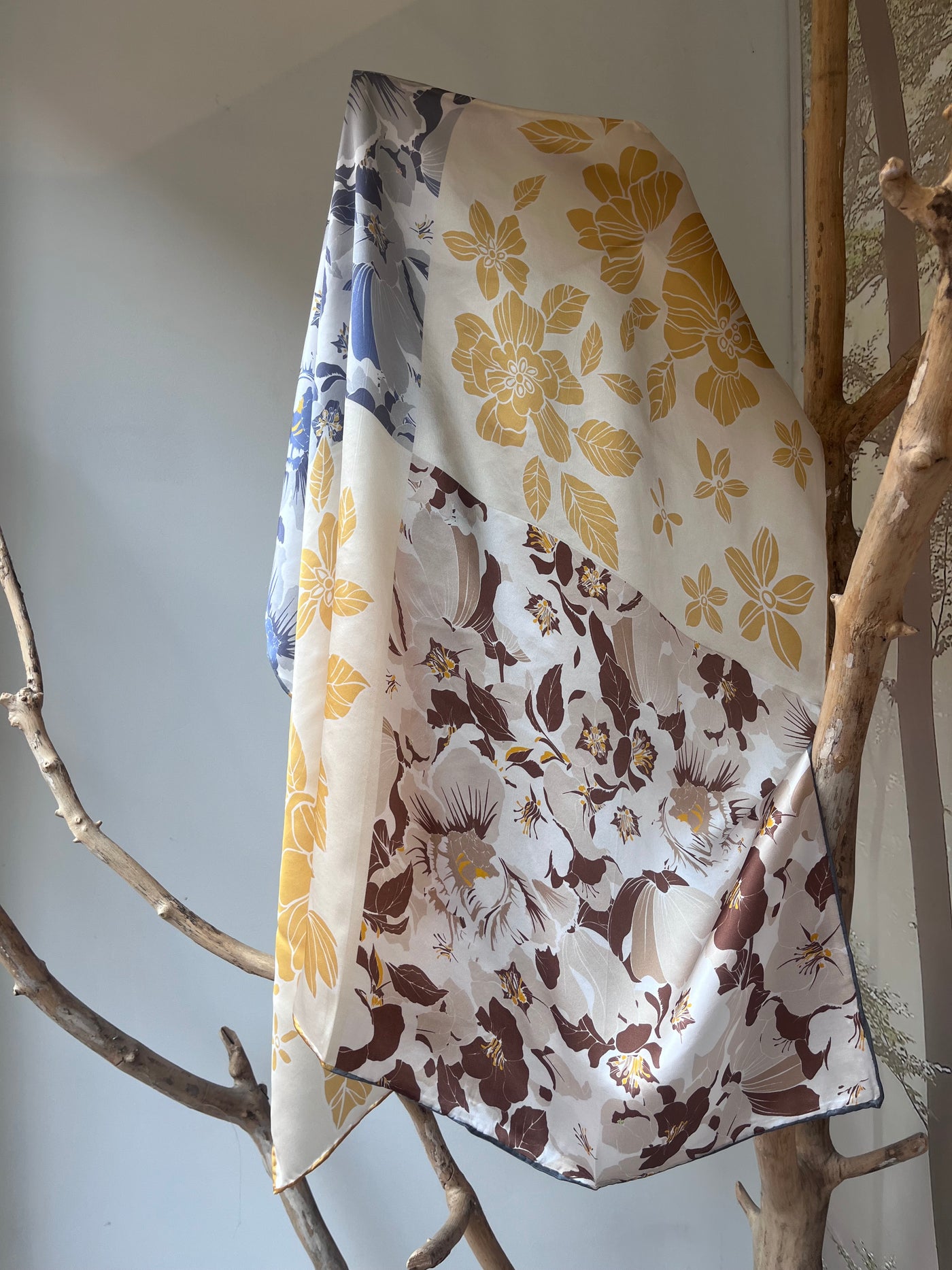 Šilkinė skarelė su geltonais, mėlynais ir rudais gėlių motyvais