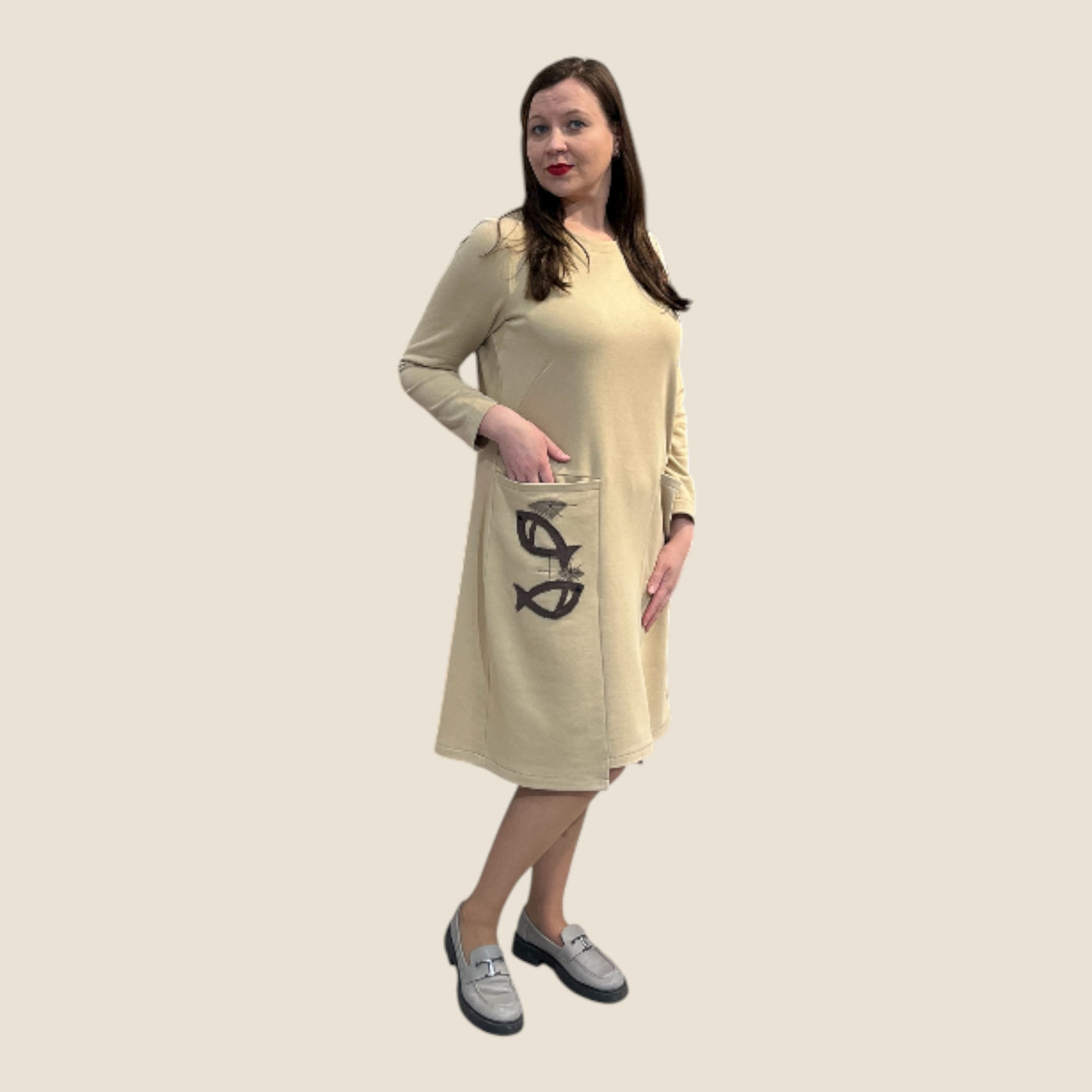 Trikotažinė suknelė su kišene ir rankų darbo dekoru – dydžiai 36–52 - 36 / Smėlinė