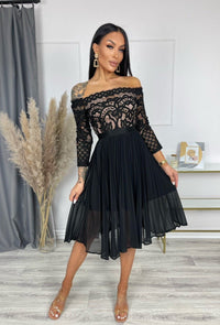 Kai norisi atrodyti ypatingai be didelių pastangų – ši juoda suknelė tampa patikimu pasirinkimu. Lengvai krentantis klostuotas sijonas suteikia judesiui lengvumo, o subtilus gipiūro viršus kuria prabangos įspūdį. Tai suknelė, kuri puikiai tiks vakarėliui, šventei ar elegantiškam pasimatymui.