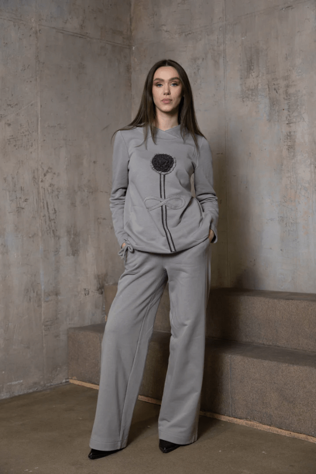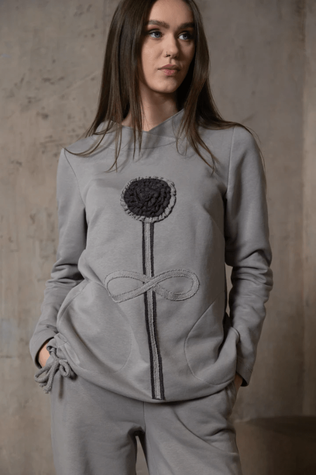 Išskirtinis cemento spalvos moteriškas džemperis – stiliaus ir patogumo derinys jūsų laisvalaikiui. Priekyje išsiuvinėtas rankų darbo pienės dekoras suteikia drabužiui originalumo ir išskirtinumo.