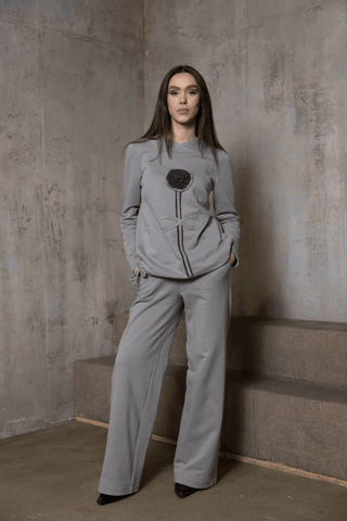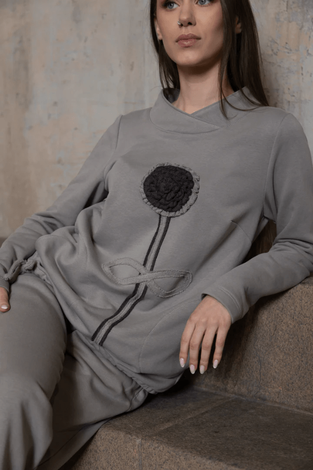 Cemento spalvos džemperis su rankų darbo pienės dekoru