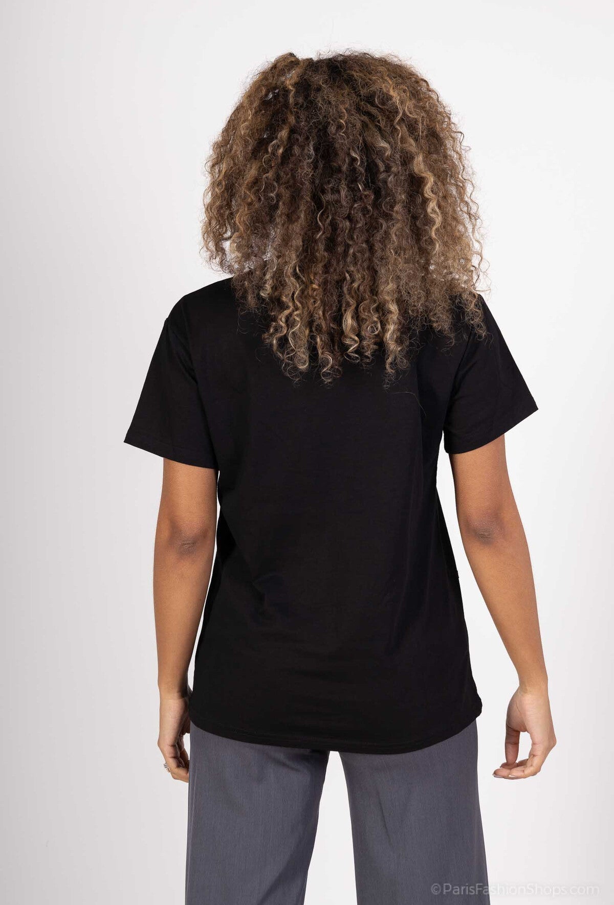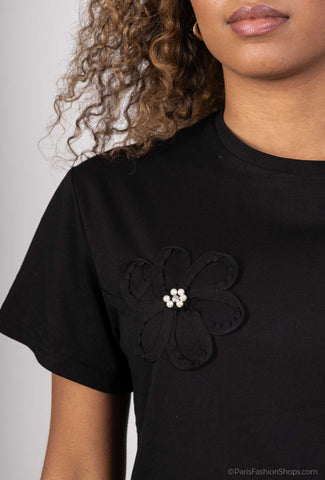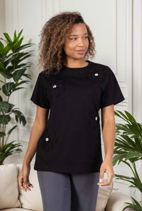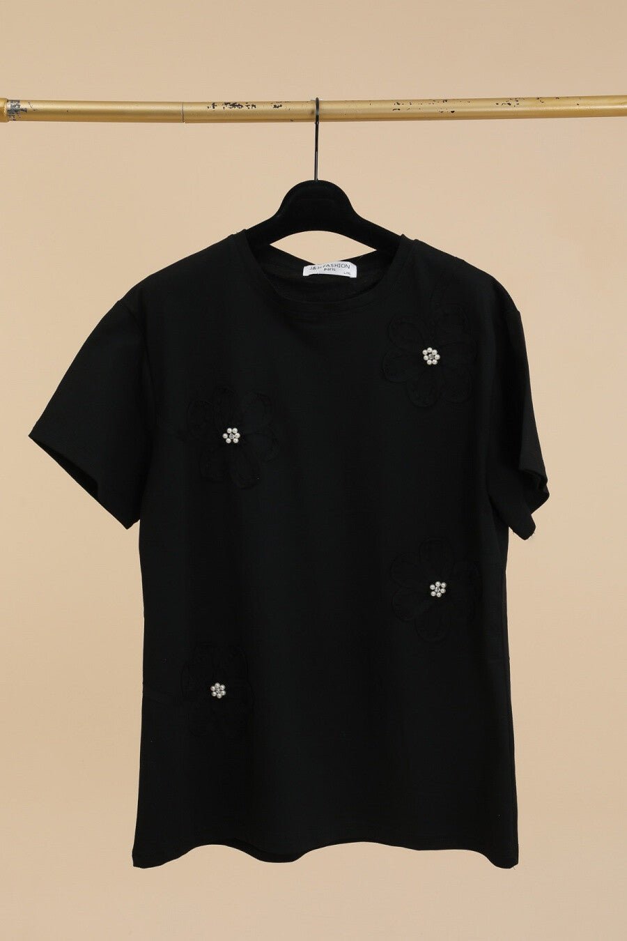 tilinga ir elegantiška juoda palaidinė – subtilumo ir patogumo derinys. Priekis dekoruotas keturiomis dailiomis gėlėmis, kurių centre išsiuvinėti perliukai, suteikiantys išskirtinį akcentą. Palaidinė pagaminta iš aukštos kokybės trikotažo, kuriame 95 % medvilnės ir 5 % elastano, užtikrinant komfortą bei lengvą prigludimą prie kūno.