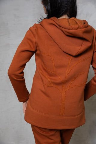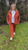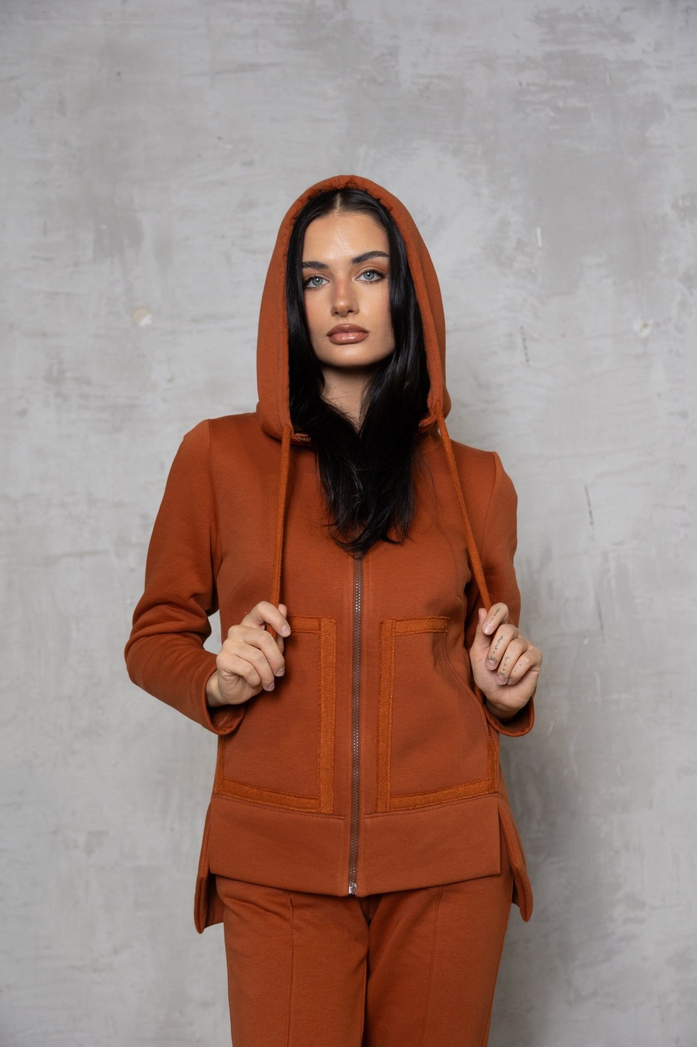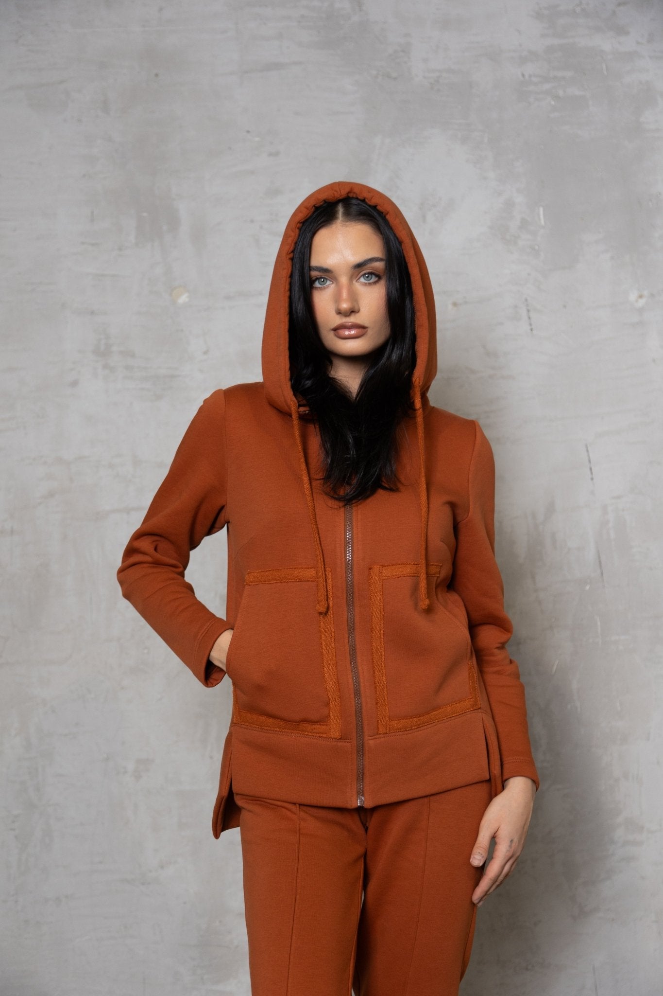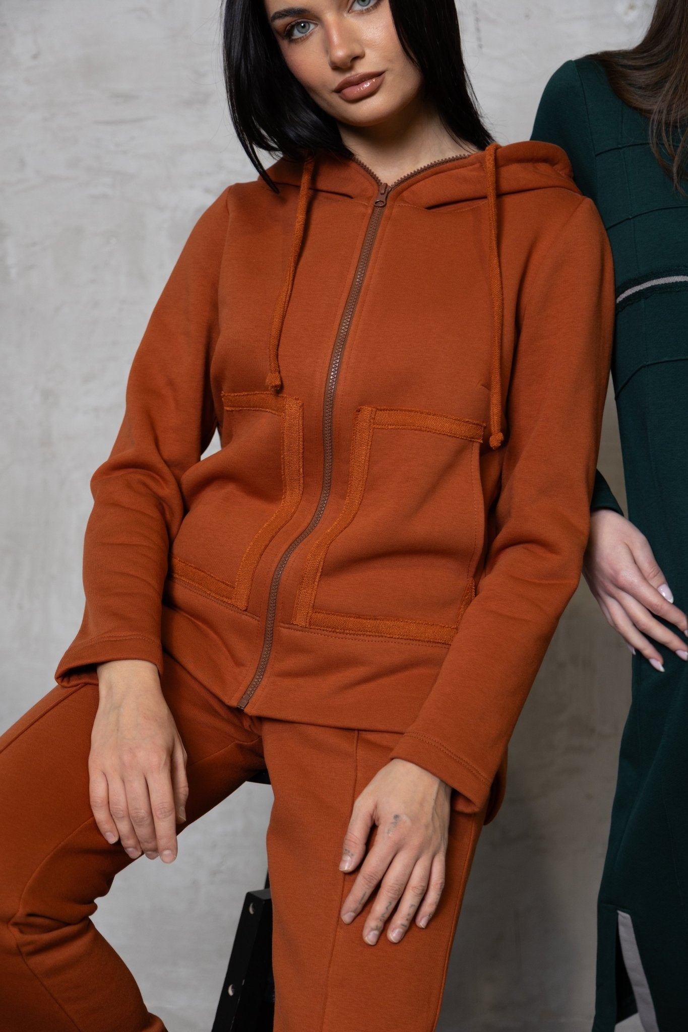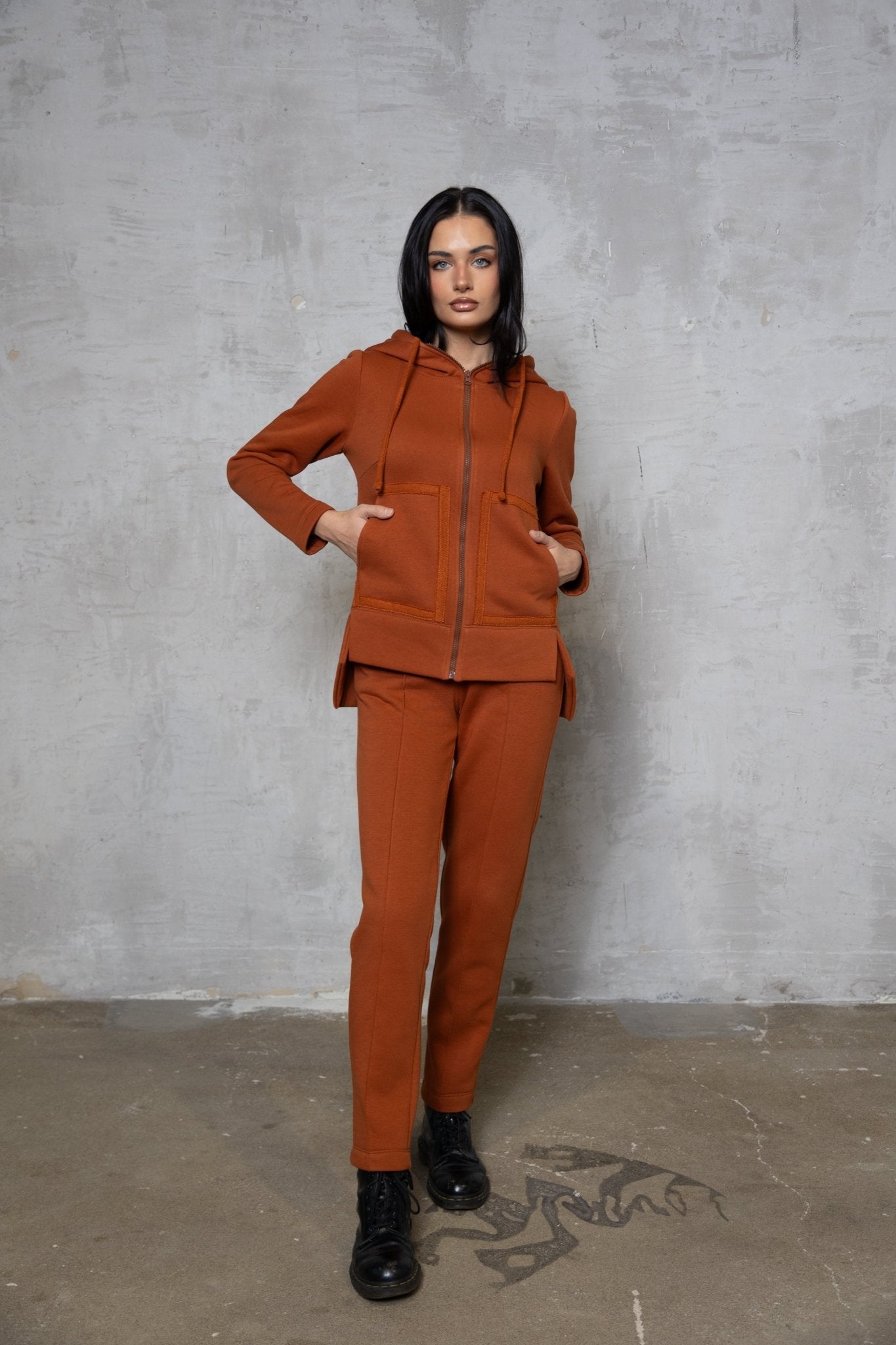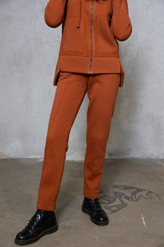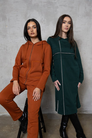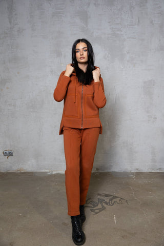 Stilingas ir patogus terecotos oražinės spalvos dviejų dalių laisvalaikio kostiumas