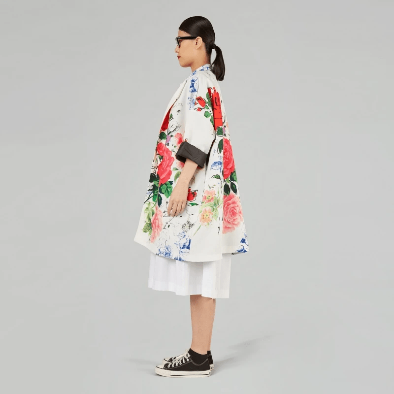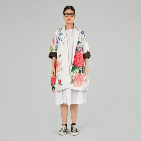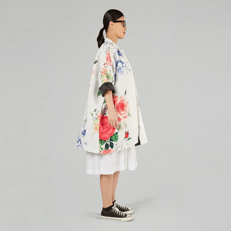 Kimono stiliaus paltukas – baltas su spalvotomis gėlėmis