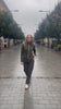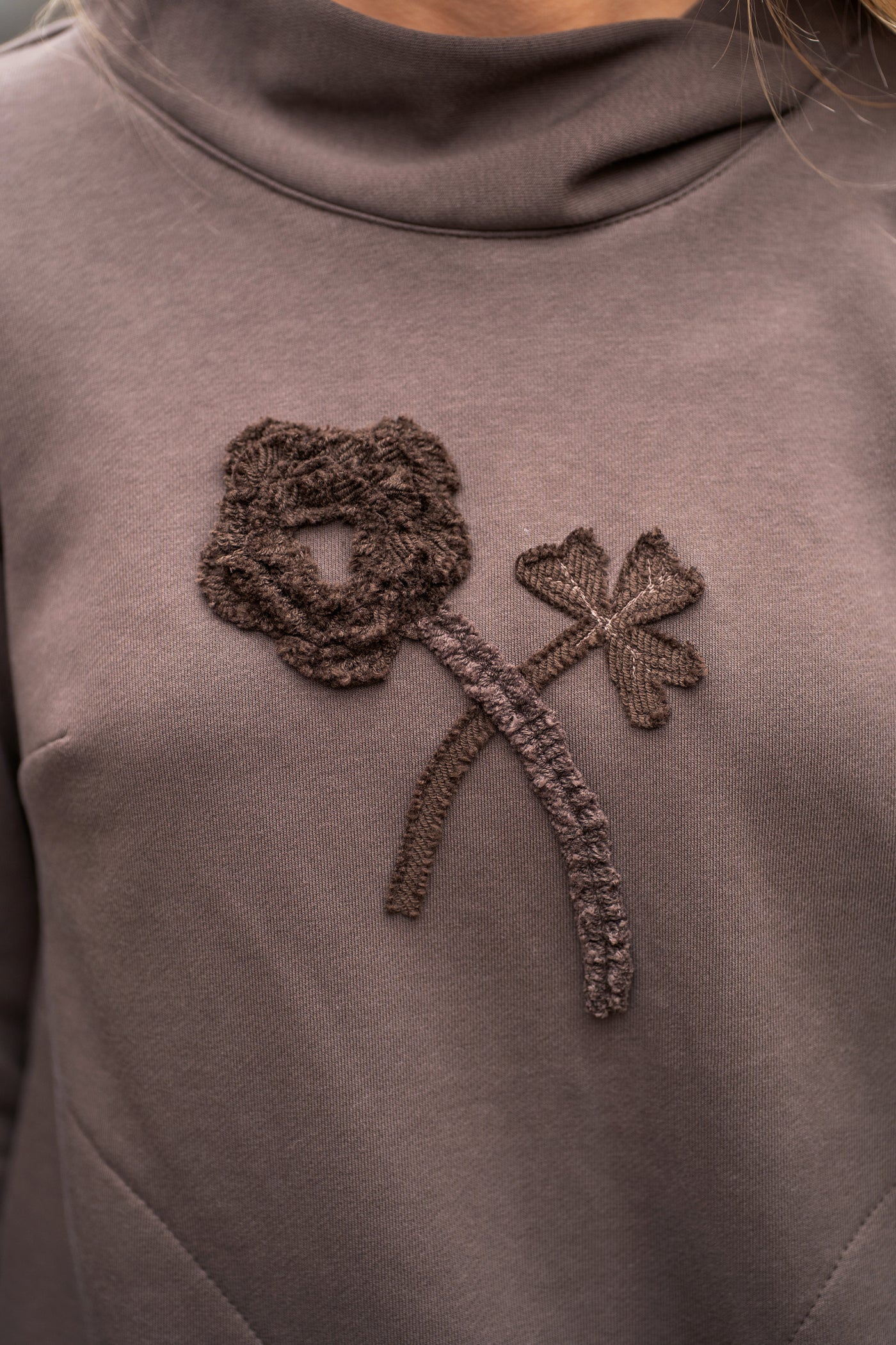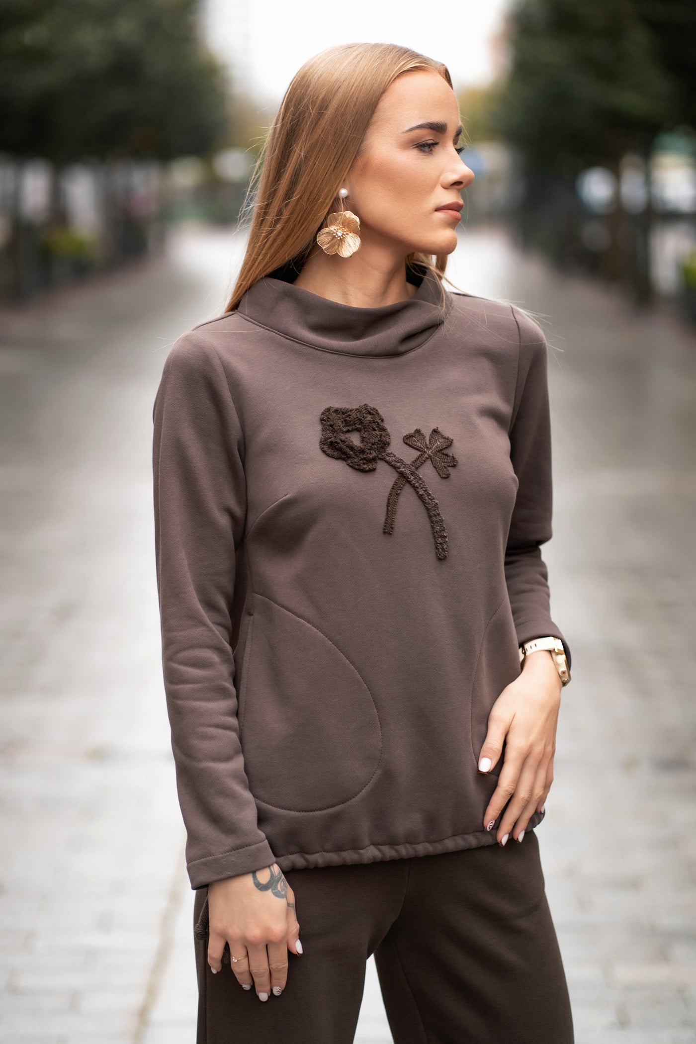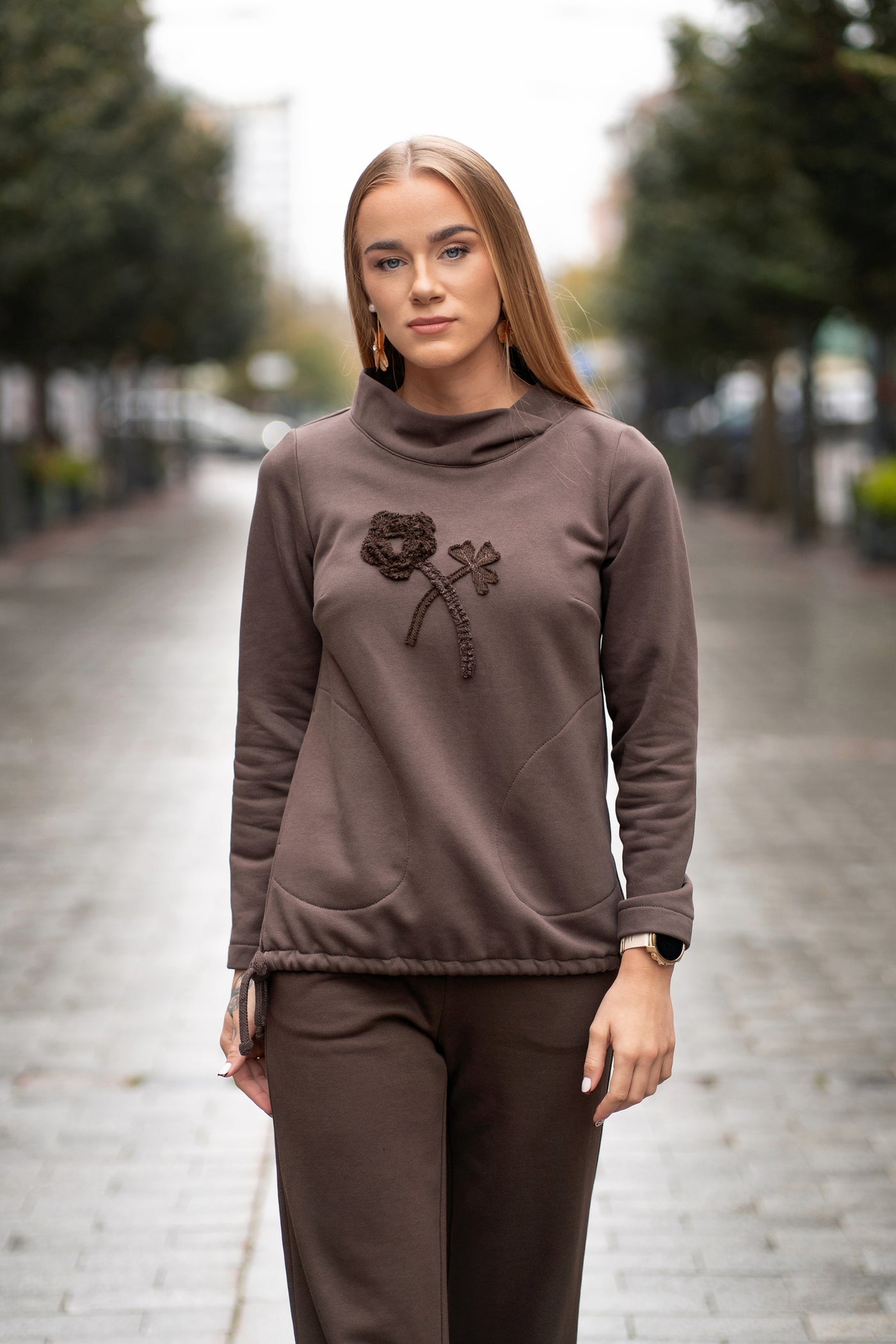 Džemperis turi subtilią stovėlę, statytas rankoves, krūtinės įsiuvus, dvi kišenes ir rankų darbo dekorą priekyje, kuris suteikia išskirtinumo ir elegancijos. Džemperio ilgis – apie 60 cm, apačia reguliuojama raištelio pagalba, todėl lengvai prisitaiko prie figūros.