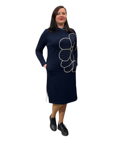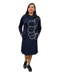 Tamsiai mėlyna trikotažinė suknelė su rankų darbo gėle, tiesaus silueto Išpardavimas