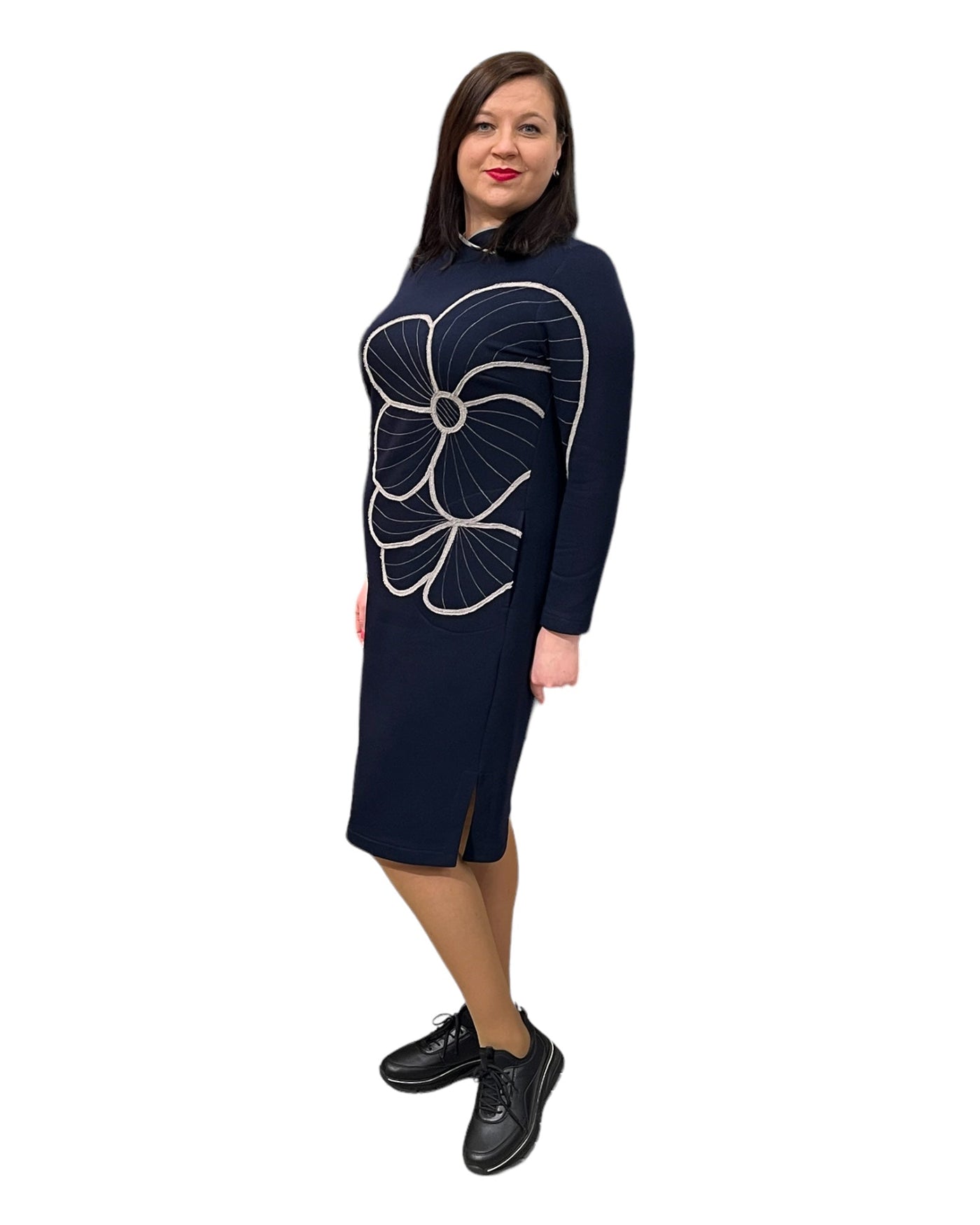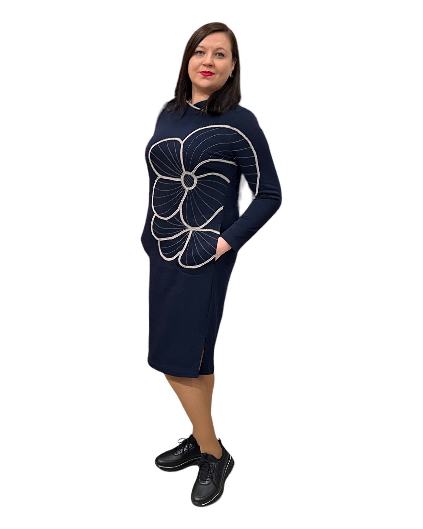 Tamsiai mėlyna trikotažinė suknelė su rankų darbo gėle, tiesaus silueto - 36 / Tamsiai mėlyna