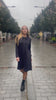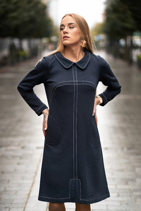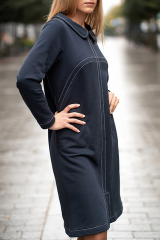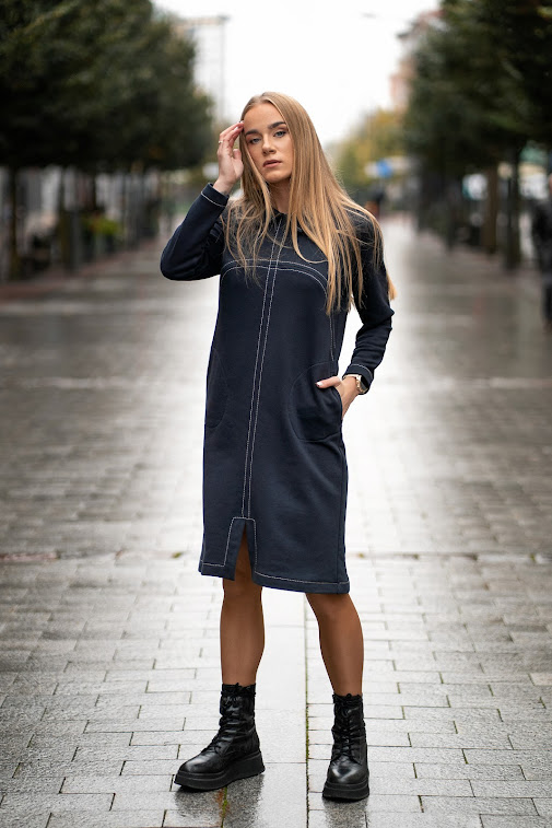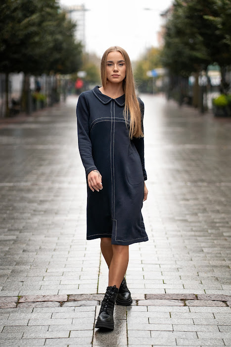 Elegantiška trikotažinė suknelė su apykakle ir priekiniu skeltuku – tamsiai mėlyna, tamsiai žalia, kapučino, bordo, raudona - 36 / tamsiai mėlynas