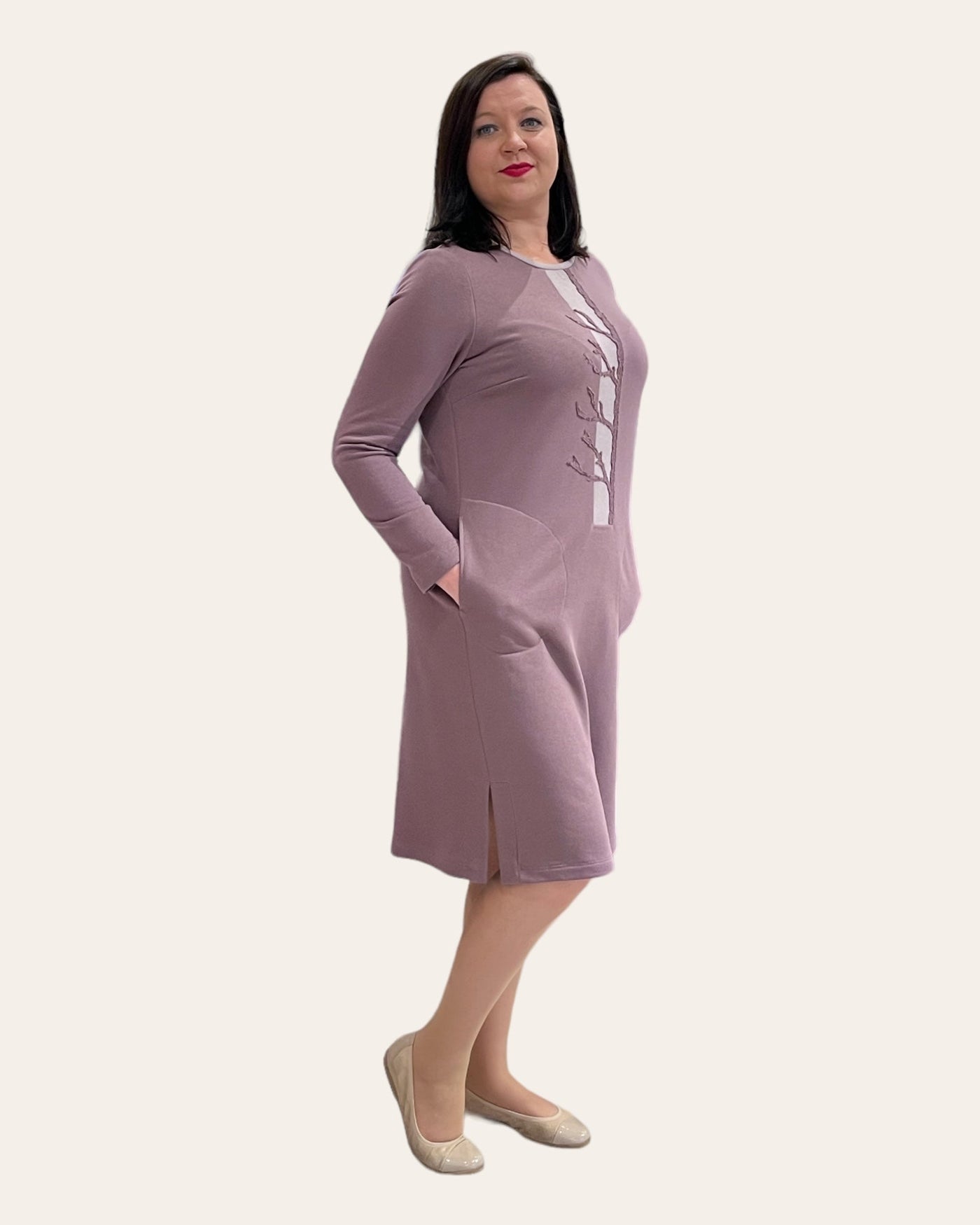 Ši suknelė pasiūta iš labai kokybiško, vidutinio storumo trisiūlio trikotaž