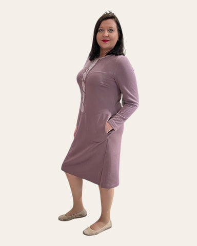Dydis atitinka. Yra kišenės, šonuose skeltukai. Priekį puošia rankų darbo ornamentai. Suknelės ilgis- 98-102 cm, priklausomai nuo dydžio. Dydžiui didėjant suknelė- ilgėja.